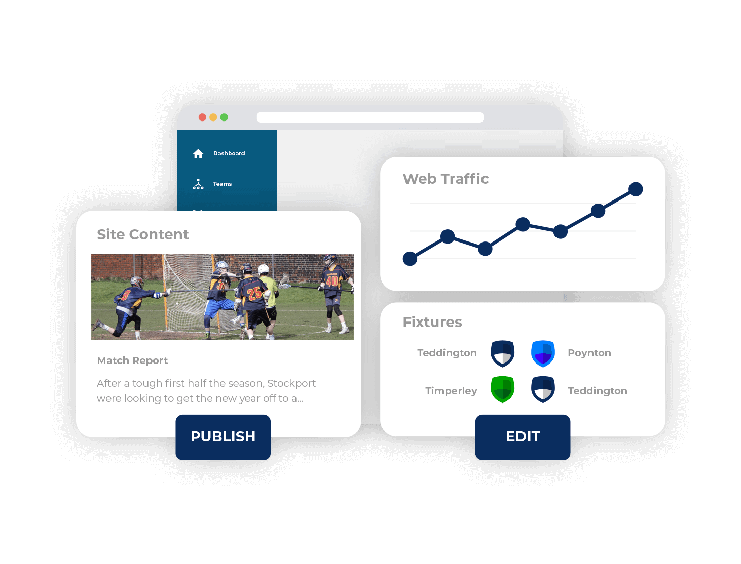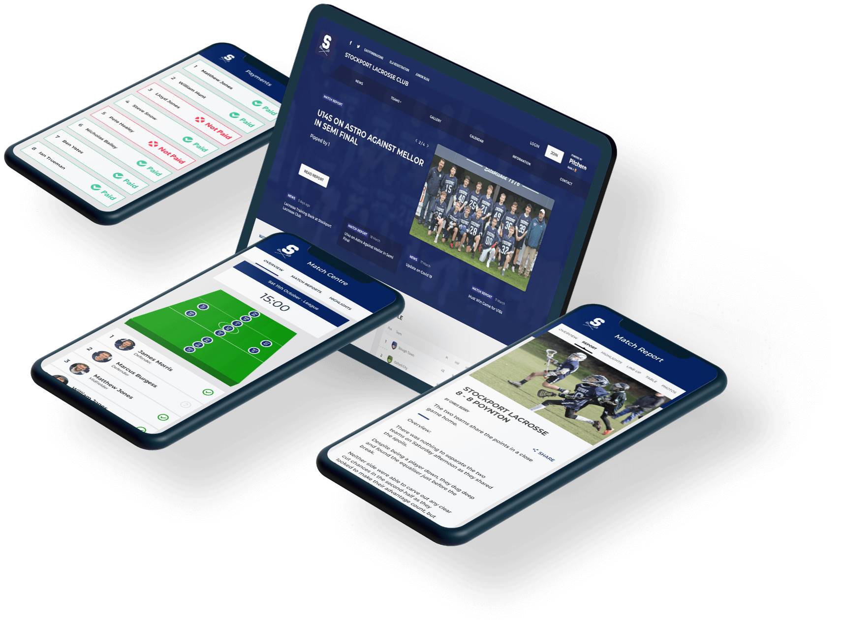 Manage every part of your club from our fully hosted, easy-to-use control panel. Plus, share the work by giving restricted access to club officials and team coaches. Allow individual coaches to log in and manage their team records, fixtures, results and match report.